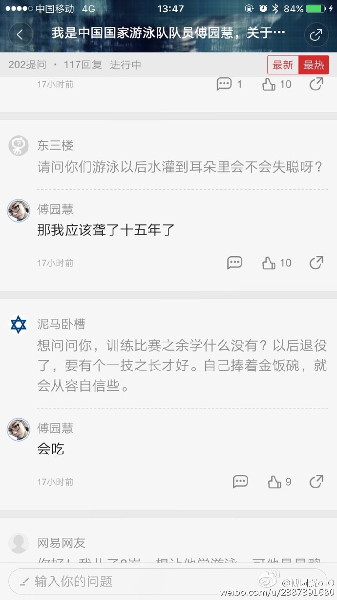 傅园慧:已经是最好成绩了。我用了三个多月去做恢复,鬼知道我经历了什么,真的太辛苦了,有时候我都觉得我快要死了,我当时的训练真是生不如死,但今天的比赛我已经心满意足了。
