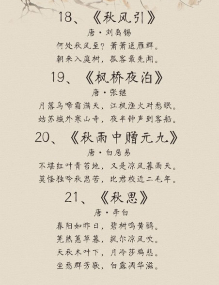 【少儿书刊】秋天,是丰收的季节,也是文人咏诗颂词的时节。“空山新雨后”的沁人心脾,“江清月近人”般的静谧祥和,“轻罗小扇扑流萤”般的轻松,“无边落木萧萧下”的凄凉肃杀,“秋花惨淡秋草黄”的悲凉……秋天在文人笔下各有特色。读读下面这些诗词,感受秋风古韵吧!